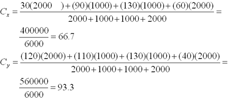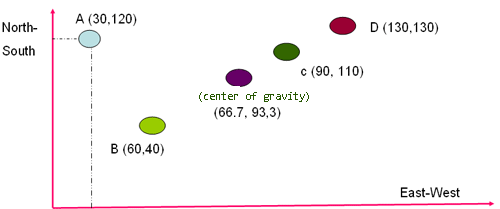 A department store has branches in four locations: A, B, C and D. Department Store has a Ware House at D and plans to seek the central location of the new house ware. Previously, it has been determined in advance the coordinates of 0.0. Store locations in A (30.120); D (130, 130), C (90, 110) and B (60.40). Total demand for containers every month for A (2000); D (1000), C (1000) and B (2000). Location A has coordinates d (1, x) = 30, d (1, y) = 120, and W1 = 2000. By using equations Center of gravity is obtained the desired central location.