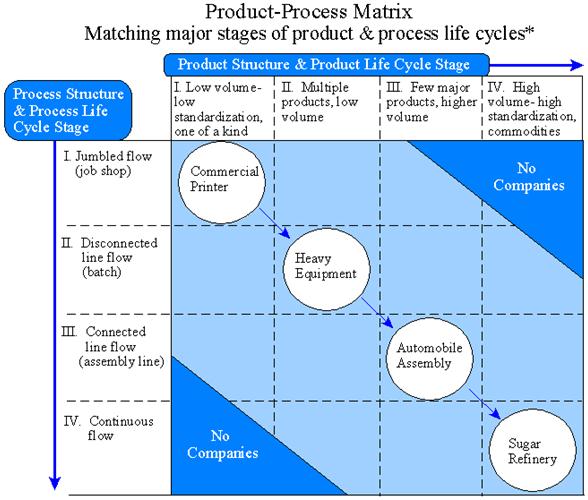 This matrix shows that the increase in output and deepening of specialization of production line (horizontal axis) are making specialized equipment and streamlined material flow (vertical axis) cost-effective. Because the structure of this evolution is often correlated with the stages of product life cycle (development of production, increase production and stage of maturity), this matrix is very convenient to reflect the interrelationship of marketing and production strategies.