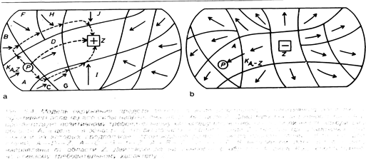 Динамическим компонентом модели окружения является поле сил, центр которого может лежать, как это изображено на рис. 5.4, в областях с позитивной или негативной валентностью. На субъекта воздействуют силы определенной интенсивности, и их результирующий вектор определяет направление и силу его психических локомоций. Если же в противоположном направлении действуют силы приблизительно такой же интенсивности, возникает конфликт. Направление означает при этом последовательность отдельных целевых действий. Часто действие разными путями ведет к одной и той же цели, психологическое направление в этом случае остается неизменным, имеет место эквивалентность исходов целенаправленного поведения.