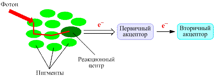 Световая стадия фотосинтеза осуществляется в сложной супрамолекулярной системе, которая включает светособирающий комплекс, содержащий различные пигменты (хромофоры), реакционный центр (пигмент-белковый комплекс, в котором находится димер хлорофилла), а также первичный и вторичные акцепторы электрона.