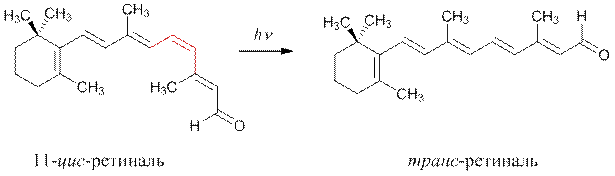 Зрение начинается с фотохимической реакции цис-транс -изомеризации ретиналя, которая вызывает конформационные изменения в белковом комплексе.
