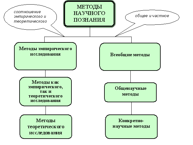 Методы научного познания включают так называемые всеобщие методы, т.е. общечеловеческие приемы мышления, общенаучные методы и методы конкретных наук. Методы могут быть классифицированы и по соотношению эмпирического знания (т.е. знания полученного в результате опыта, опытного знания) и знания теоретического, суть которого - познание сущности явлений, их внутренних связей. Классификация методов научного познания представлена на рис. 1,2.