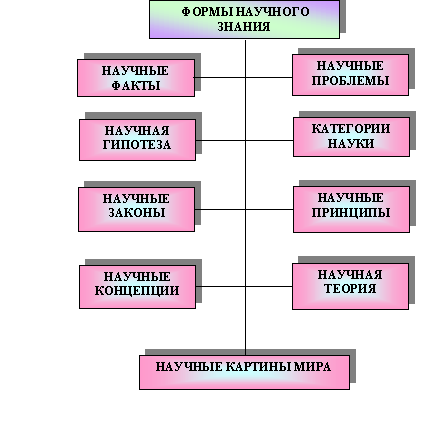 К формам научного знания относят проблемы, научные факты, гипотезы, теории, идеи, принципы, категории и законы (см. рис.4).