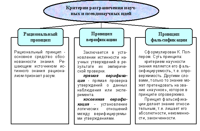 В настоящее время, в силу ряда объективных причин в мире оказались весьма сильны антинаучные тенденции, представляющие собой заявку на понятное всем, четкое миропонимание, отличное от того, которое дает классическое естествознание. При этом в общественном сознании размывается грань между наукой и псевдонаукой, наукой и мистикой. В этих условиях важно знать критерии разграничения научных и псевдонаучных идей. На схеме рис. 6 даны принципы, справедливые для научных теорий, научного знания, которые отличают научное знание от псевдонаучного.