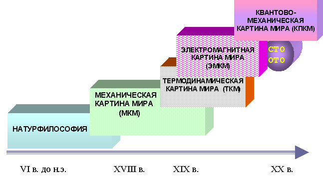 В истории науки научные картины мира не оставались неизменными, а сменяли друг друга, таким образом, можно говорить об эволюции научных картин мира. Наиболее наглядной представляется эволюция физических картин мира: натурфилософской – до 16-17 вв., механистической – до второй половины 19 в., термодинамической (в рамках механистической теории) в 19 в, релятивистской и квантово-механической в 20-м веке. На рис.1 схематично представлено развитие и смена научных картин мира в физике.