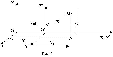 Пусть имеется ИСО XYZ, относительно ее вдоль оси движется равномерно со скоростью V0 система X’Y’Z’. Пусть в момент t = 0 начала координат О и О’ совпадают. Тогда координаты т. М в этих двух системах в некоторый момент времени t будут связаны соотношениями: