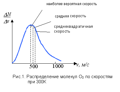 Следует заметить, что до Больцмана Максвелл ввел для описания случайного поведения молекул понятие вероятности, вероятностный (статистический закон) и вывел закон распределения числа молекул газа по скоростям. Поскольку молекулы в газе непрерывно сталкиваются друг с другом и со стенками, некоторые из них будут двигаться очень медленно, а другие - очень быстро. Распределение молекул по скоростям показано на рис.1. (Аналогичный вид имеет распределение молекул по энергии). Как видим, эти распределения несимметричны относительно средних значений скорости (и энергии).