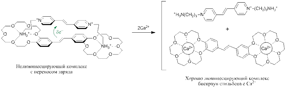 Этот комплекс не люминесцирует из-за сверхбыстрой дезактивации возбужденного состояния с переносом заряда вследствие обратного переноса электрона. Оказалось, что ионы кальция способны замещать акцепторный компонент в супрамолекулярном комплексе. Получающийся комплекс бискраун стильбена с Ca2+ характеризуется большим квантовым выходом флуоресценции (0.35).