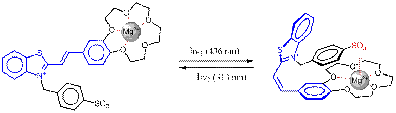 Краунсодержащий стириловый краситель, показанный ниже, в свободной форме или в форме комплекса с Mg2+ легко подвергается фотоизомеризации, которая является фотохимически обратимой. В случае цис -изомера сульфогруппа образует внутримолекулярную связь с катионом металла, находящимся в полости макроцикла. Благодаря этому свойству цис -изомер по сравнению с исходным транс -изомером образует намного более устойчивый комплекс с Mg2+.