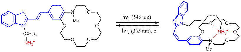 В случае стирилового красителя, содержащего аммониогексильную цепочку, фотогенерированный цис -изомер, наоборот, намного хуже связывает катионы металлов, чем исходный транс -изомер, так как краун-эфирный фрагмент в цис -изомере образует внутримолекулярный комплекс с катионом аммония.
