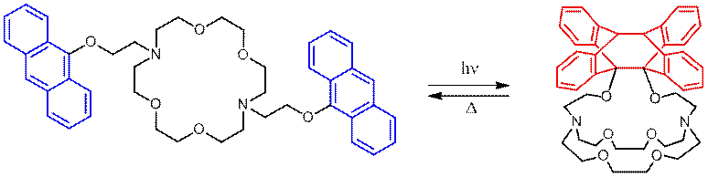 Диазакраун-эфир, представленный ниже, содержит два антраценовых ядра, которые подвергаются внутримолекулярной фотодимеризации. В результате этой реакции получается криптанд. Криптанды, как известно, образуют более устойчивые комплексы с катионами металлов, чем краун-эфиры.