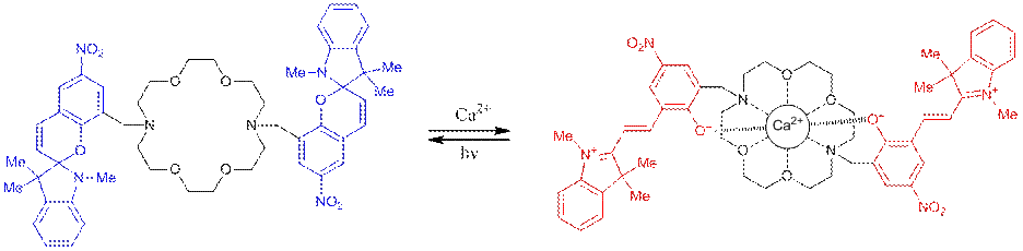 В присутствии ионов Ca2+ термическое равновесие сдвигается в сторону раскрытой окрашенной формы. Эта форма стабилизируется благодаря внутримолекулярной ассоциации катиона металла, находящегося в полости краун-эфира, с двумя фенолятными анионами. Фотоиндуцированное замыкание пирановых колец приводит к снижению устойчивости комплекса с Ca2+.