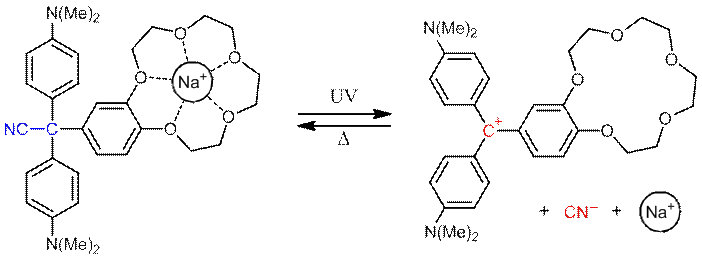 Фотохромизм трифенилметановых красителей обусловлен реакцией фотодиссоциации. При фотодиссоциации краунсодержащего красителя, показанного ниже, отщепляется цианид-анион. В результате способность краун-эфирного фрагмента связывать ион Na+ резко снижается из-за кулоновского отталкивания между образовавшимся органическим катионом и катионом металла.