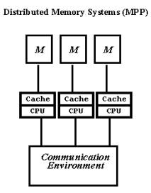 Системы с распределенной памятью идеально подходят для параллельного выполнения независимых программ, поскольку при этом каждая программа выполняется на своем узле и никаким образом не влияет на выполнение других программ. Однако при разработке параллельных программ приходится учитывать более сложную, чем в SMP системах, организацию памяти. Оперативная память в MPP системах имеет 3-х уровневую структуру: