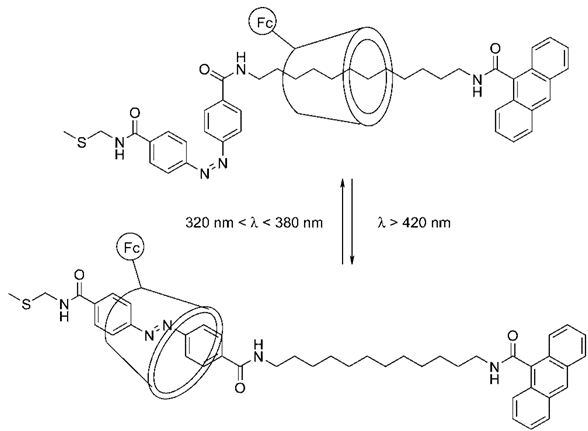 В качестве инструмента, способного обеспечить масштабные и обратимые структурные изменения, может быть использована реакция транс-цис- фотоизомеризации. Прототипом фотоуправляемой молекулярной машины, которая работает на основе фотоизомеризации, является ротаксановый комплекс с участием циклодекстрина и производного азобензола. Фотоиндуцированный переход азобензольного хромофора из транс- в цис -форму приводит к смещению циклодекстринового челнока в область алкильной цепи.