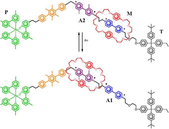 Этот комплекс имеет светособирающий фрагмент P, два электроноакцепторных компонента A1 и А2, из которых A1 является более сильным акцептором, макроциклический фрагмент M и стоппер T. В исходном состоянии макроцикл M связан с более сильным акцептором A1. После поглощении фотона светособирающим фрагментом P происходит перенос электрона на акцептор A1, в результате чего макроцикл M перемещается к акцептору А2.