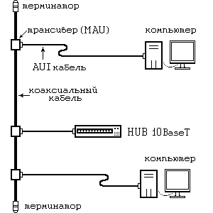 | Устройства подключаются к сети посредством устанавливаемого на кабель трансивера (transceiver - MAU(Media Access Unit)). | |