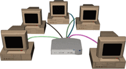 Для построения сети с звездообразной архитектурой в центре сети необходимо разместить концентратор(hub) или коммутатор(switch). Его основная функция - обеспечение связи между компьютерами, входящими в сеть. То есть все компьютеры, включая файл-сервер, не связываются непосредственно друг с другом, а присоединяются к концентратору. Такая структура надежнее, поскольку в случае выхода из строя одной из рабочих станций все остальные сохраняют работоспособность. В сетях же с шинной топологией в случае повреждения кабеля хотя бы в одном месте происходит разрыв единственного физического канала, необходимого для движения сигнала. Кроме того, сети с звездообразной топологией поддерживают технологии Fast Ethernet и Gigabit Ethernet, что позволяет увеличить пропускную способность сети в десятки и даже сотни раз (разумеется при использовании соответствующих сетевых адаптеров и кабелей). 100 и 1000 Мбитные сети строятся по топологии "Звезда".