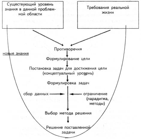 Для разрешения возникающего между требованиями практики и существующим уровнем знаний противоречия нужно четко выявить суть возникшей проблемы, поставить задачу, провести ее структуризацию (выявить элементы проблемы и их соотношения), затем нужна параметризация (т.е. выявление переменных, полностью описывающих задачу), после чего возможно построение плана исследования. В этом исследовании должно быть запланировано проведение экспериментов или сбор данных, их обработка и определение метода решения проблемы.