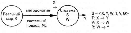 Системный подход является более прагматической методологией решения проблем. Суть его заключается в представлении объектов реального мира R в форме систем, т.е. множества взаимодействующих элементов и их отношений (рис. 15).