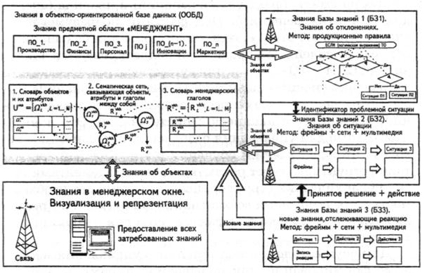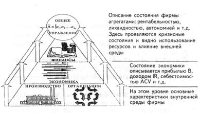 Если проанализировать представленную пирамиду, то можно увидеть, что априорными факторами являются производственные и организационные переменные. Средний уровень пирамиды, представленный как экономика, содержит в себе по существу предметную область менеджмента в целом. Все процессы, инициированные производством и организацией и управляемые и видоизменяемые посредством экономики, проявляются через систему финансового менеджмента в виде уже не качественных, а количественных измеримых показателей. Все эти показатели определяются через систему документооборота фирмы и стандартных форм финансовой отчетности — такие, как баланс, отчет о прибылях и убытках и др. Для осуществления эффективного управления фирмой и выявления вектора альтернативных решений после идентификации вектора первичных показателей необходимо осуществить процедуру анализа знаний элементов первичного вектора и «спуститься вниз пирамиды», тем самым выявляя причинно-следственные связи и идентифицируя цепочку событий, вызывающих появление первичного вектора. Указанная система формирования знаний на метауровне позволит повысить эффективность управления фирмой в целом.