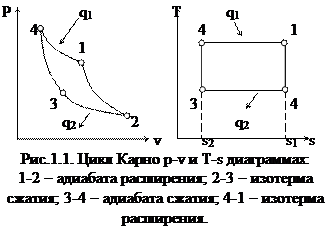 Циклом Карно называется круговой цикл, состоящий из 2-х изотермических и из 2-х адиабатных процессов. Обратимый цикл Карно в p-v и T-s диаграммах показан на рисунке 1.1.