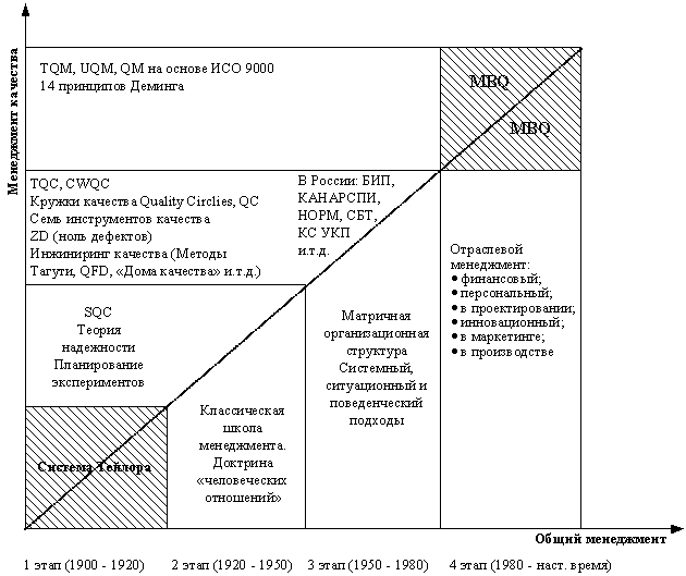 Основой и общего менеджмента, и менеджмента качества является система Ф. У. Тейлора, который, по существу, создал концепцию научного менеджмента. Система Тейлора включала понятия верхнего и нижнего пределов качества, поля допуска, вводила такие измерительные инструменты, как шаблоны и калибры, а также обосновывала необходимость независимой должности инспектора по качеству, разнообразную систему штрафов для бракоделов, форм и методов воздействия на качество продукции. Но целевая установка системы управления качеством сводилась к обеспечению определенных кондиций отдельных изделий, узлов и деталей. Дальнейшие действия в этом направлении приводили к значительному росту затрат, снижению эффективности производства.