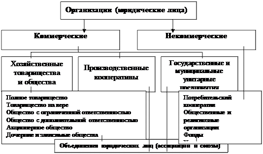 Юридическим лицом признаётся организация, которая зарегистрирована в установленном порядке, имеет расчётный счёт в банке, имеет в собственности, хозяйственном ведении или оперативном управлении обособленное имущество, отвечает по своим обязательствам этим имуществом, может от своего имени приобретать и осуществлять имущественные и личные неимущественные права, выполняет возложенные обязанности, имеет самостоятельный баланс или смету, может быть истцом и ответчиком в суде. К коммерческим организациям отнесены хозяйственные товарищества и общества, производственные кооперативы, государственные и муниципальные унитарные предприятия, а к некоммерческим – потребительские кооперативы, общественные или религиозные организации (объединения), благотворительные и другие фонды, учреждения. Наряду с перечисленными «единичными» формами существуют и объединения коммерческих и/некоммерческих организаций – ассоциации и союзы (см. рисунок 3.10).