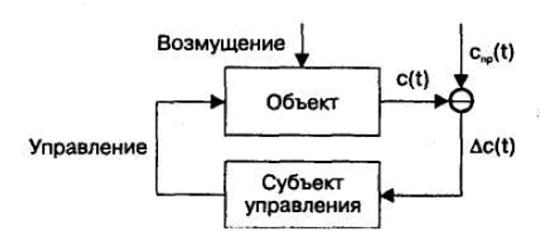 Принцип замкнутого управления позволяет решить задачу управления при любом характере действующих возмущений. В этом случае управляющим сигналом служит само возмущение. Таким образом, принцип замкнутого управления учитывает не только задание, но и фактическое состояние объекта и действующих возмущений. Данный принцип является наиболее универсальным (пример: выбор депутатами законопроектов для работы над ними).
