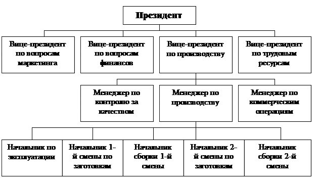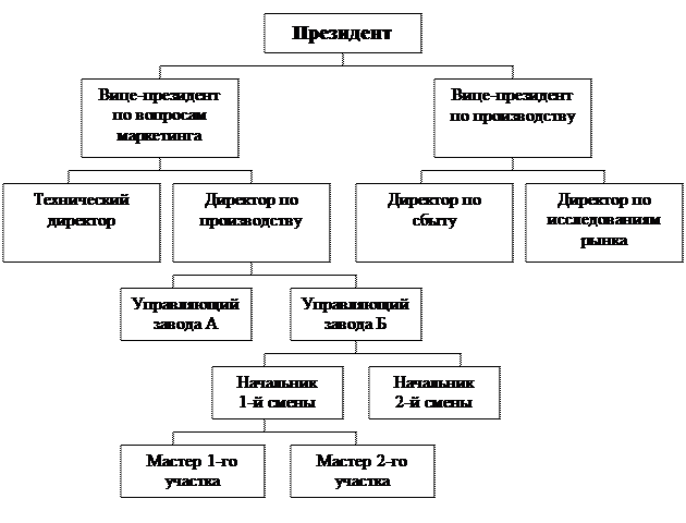 Объем управления. Вертикальное разделение труда, т.е. отделение работы по координации от непосредственного выполнения заданий, необходимо для успешной групповой работы. Преднамеренное вертикальное разделение труда в организации дает в результате иерархию управленческих уровней. Центральной характеристикой этой иерархии является формальная подчиненность лиц на каждом уровне. Лицо, находящееся на высшей ступени управления, может иметь в своем подчинении нескольких руководителей среднего звена, представляющих различные функциональные области. Эти руководители среднего звена могут в свою очередь иметь несколько подчиненных из числа линейных руководителей. Например, руководитель производства может иметь в своем подчинении до 10 начальников, включая руководителей смен и различных функциональных зон. Иерархия пронизывает всю организацию, спускаясь на уровень неуправленческого персонала. Рис. 7.6. представляет пример вертикальной иерархии.