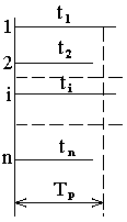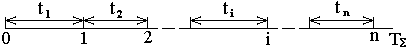 Для опытного определения показателя безотказности восстанавливаемого объекта проводится наблюдение за испытанием или эксплуатацией данного объекта в течение некоторой суммарной наработки ТS в заданных условиях. При этом определяются наработки между соседними отказами (рисунок 2.2), которые образуют ряд опытных наработок t1, t2, …,ti, …,tn, где i-номер i-ой наработки объекта до i-го номера его отказа.