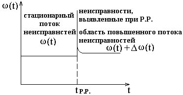На рисунке 4.7 приведен пример возможного характера изменения потока неисправностей ω(t) вследствие недостаточного качества выполнения Р.Р. К потоку неисправностей вследствие указанного фактора добавляются неисправности Δω(t), не присущие данному типу объекта и не обусловленные уравнением его надежности. Δω(t) является последствием вмешательства личного состава в состояние объекта.