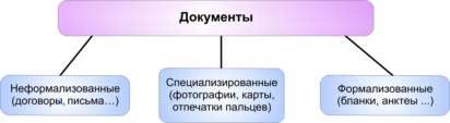Формализованные документы - это документы, в которых заранее определена форма: расположение обязательных полей, в которые заносятся данные. Например, бланки, накладные, анкеты, картотеки и т.д. Неформализованные документы - это документы произвольной формы: договоры, письма и т.д. К специализированным относятся такие документы как, например, карты и отпечатки пальцев.