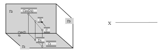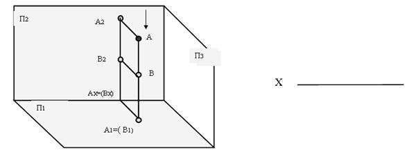 • Все точки отрезка перпендикулярного П2 лежат на одном проецирующем луче, направленном перпендикулярно к фронтальной плоскости проекций;