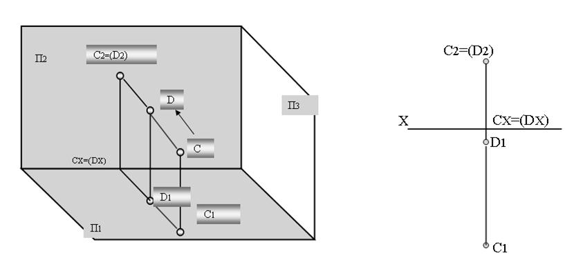 Все точки такой прямой лежат на одном проецирующем луче, конкурируют друг с другом относительно горизонтальной плоскости проекций и сливаются на плоскости проекций П1 в одну точку.