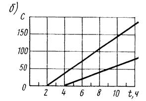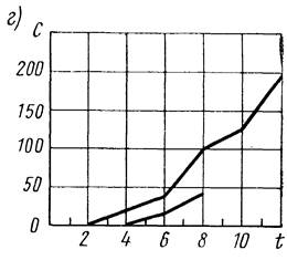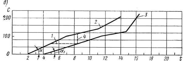 а — дифференциальная равномерная; б — интегральная равномерная; в — дифференциальная неравномерная; г — интегральная неравномерная; д — расчет запаса в физических объемах во времени на интегральной эпюре; 1 — величина запаса в днях работы; 2 — линия поставок; 3 — линия расхода; 4 — физический объем запаса.