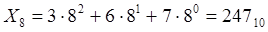 Нижний индекс в записи числа указывает на основание используемой системы счисления. В принципе, роль основания способно играть любое вещественное число. Переход от системы счисления с произвольным основанием к десятичной системе счисления осуществляется при помощи выражения 1.1, которое справедливо как для целой, так и для дробной частей числа. Возьмем, например, восьмеричное число 3678 и преобразуем его в десятичное. Вполне логично записать это число как