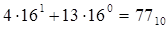 Кроме двоичной в цифровых вычислительных устройствах часто применяются восьмеричная, шестнадцатеричная и десятичная системы счисления. В десятичной системе счисления осуществляется, как правило, ввод и вывод информации в цифровые вычислительные устройства с помощью специальных преобразователей с целью упрощения человеко-машинного взаимодействия. Восьмеричная и шестнадцатеричная системы счисления используются в основном из-за компактности записи чисел и удобства перевода двоичных кодов в восьми- и шестнадцатеричные. Для записи шестнадцатеричных чисел используются шестнадцать знаков - десять арабских цифр от 0 до 9 для записи первых десяти цифр и символы латинского алфавита от A до F для записи оставшихся шести цифр от 10 до 15 (A соответствует цифре 10, В- 11, C- 12, D- 13, E- 14, F- 15). Так, например, шестнадцатеричное число 4D16 соответствует десятичному числу 7710, так как