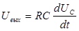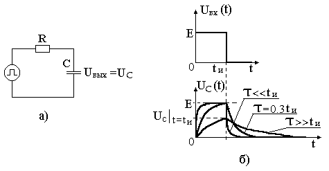 Электрическая принципиальная схема интегрирующей RC-цепи представлена на рис. 2.4(а). Коммутация напряжения на входе, рассмотренная ранее, эквивалентна подаче на вход прямоугольного импульса напряжения (рис. 2.4(б)). Как было выведено ранее, характер изменения функции UC (t)= Uвых в общем случае выражается следующими зависимостями: