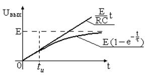 Рис. 2.5. Графики изменения идеального и реального выходных напряжений интегрирующей RC-цепи.