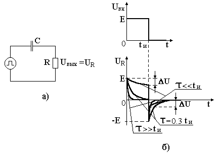 Рис. 2.6. Разделительная дифференцирующая RC-цепь и временные диаграммы напряжений.