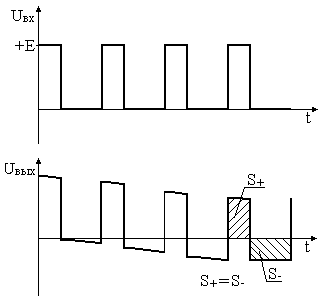 Из временной диаграммы рис. 2.7 видно, что амплитуда последовательности импульсов выходного напряжения постоянна, но при этом импульсы смещаются относительно нулевого уровня. В установившемся режиме площади под графиком S + положительной и S - отрицательной областей последовательности импульсов окажутся равными друг другу: S + = S -.