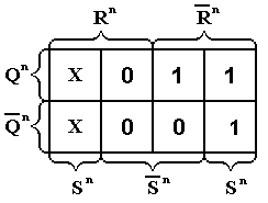 Из таблицы видно, что до тех пор, пока сигнал Cn имеет значение логического нуля, триггер сохраняет свое состояние неизменным. Как только Cn становится равным логической единицы, работа синхронного триггера разрешается, и его состояния соответствуют состояниям асинхронного триггера. Алгоритм нахождения логической функции синхронного RS-триггера аналогичен алгоритму нахождения логической функции асинхронного RS-триггера. Преобразуем таблицу переходов к виду: