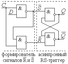 . Тогда очевидно, что D-триггер представляет собой RS-триггер, на информационные входы которого поданы сигналы в соответствии с полученными выражениями. Поскольку сигналы R и S на вход RS-триггера на базе элементов И-НЕ должны подаваться в инверсном виде, то для получения D-триггера, на входы RS-триггера необходимо подавать