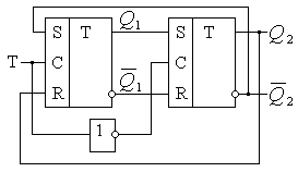 . Для этого в структуру Т-триггера вводится дополнительный второй запоминающий элемент на базе RS- или D-триггера. На синхронизирующий вход этого элемента тактовый сигнал подается в инверсном виде по отношению к тактовому сигналу первого запоминающего элемента. Подобная организация структур триггерных устройств называется двухступенчатой.