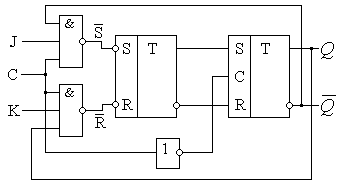 Поскольку при подаче на J - и K -входы триггер инвертирует свое состояние, т.е. выполняет функцию Т-триггера, то логично предположить, что структура синхронного JK-триггера должна повторять структуру T-триггера. В качестве базовых следует выбрать RS-триггеры. Причем, первый RS-триггер должен быть асинхронным и иметь внешнюю в структурном плане схему стробирования выходных сигналов с сигналом синхронизации C и соответствующими сигналами J и K (рис. 5.11, а). С выходов элементов И-НЕ сигналы имеют инвертированные значения, поэтому в качестве асинхронного RS-триггера следует выбирать триггер, реализованный на базе элементов И-НЕ и имеющий инверсные входы