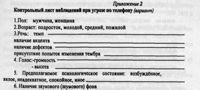 5. По окончании разговора немедленно заполнить «Лист наблюдений при угрозе по телефону».