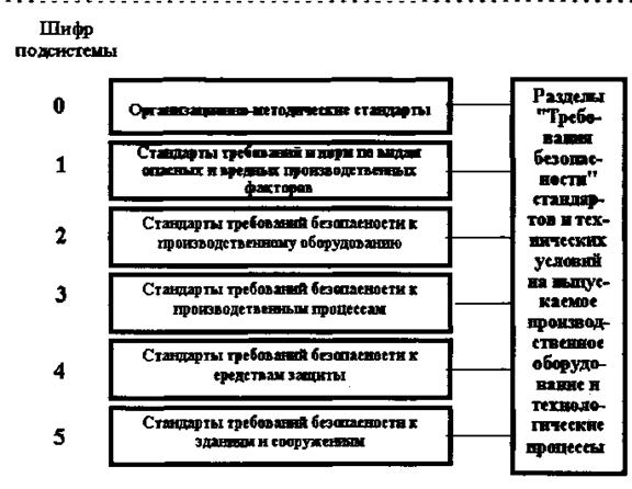 Эта система позволила стандартизировать требования безопасности путем введения раздела Требования безопасности" во все виды проектной документации (ГОСТы, ОСТы, ТУ) на серийно выпускаемую продукцию, а также в конструкторскую и технологическую документацию на ее изготовление. ССБТ включает в себя несколько подсистем (рис. 4).