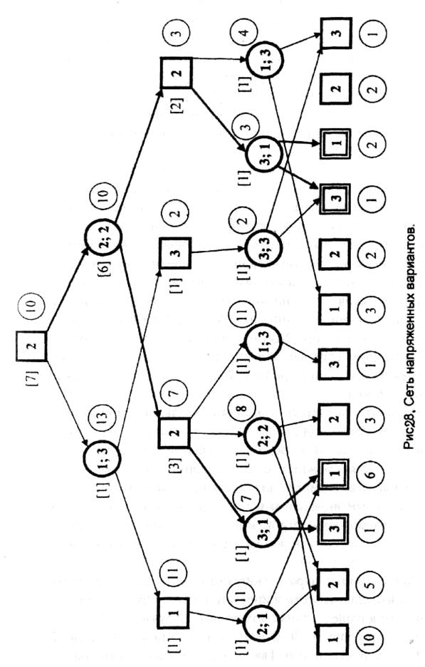В ней чередуются вершины двух типов. Вершины одного типа обозначены квадратами, в которых указаны значения обобщенных оценок, для которых нужно определить напряженные варианты в соответствующих матрицах (вход сети всегда квадрат, в котором указано значение комплексной оценки, а выходы - квадраты, в которых указаны значения оценок по направлениям). Вершины-квадраты соединены дугами с вершинами-кружками, в которых указаны все напряженные варианты для данной обобщенной оценки. Любому напряженному варианту соответствует прадерево (подграф сети) с корнем в начальной вершине. В каждую вершину-кружок этого прадерева заходит только одна дуга от вершины-квадрата более высокого уровня, а из каждой вершины-кружка выходят две дуги к вершинам-квадратам более низкого уровня (на рис. 8 один из вариантов выделен жирным дугами). Построив сеть напряженных вариантов, нетрудно определить их число.