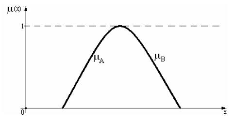 B, включающее как A, так и B с функцией принадлежности, заданной следующим образом: